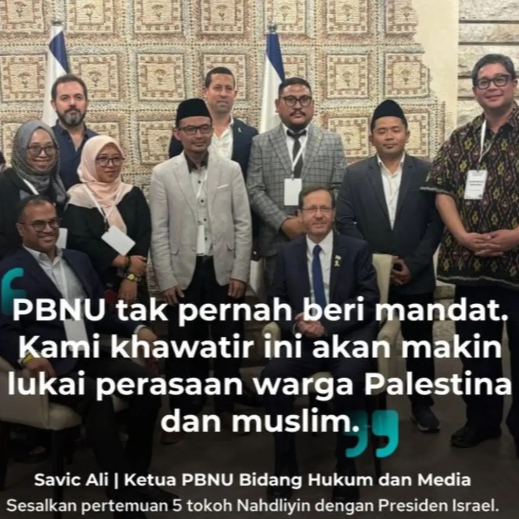 PBNU menyesalkan pertemuan lima tokoh Nahdliyin dengan Presiden Israel Isaac Herzog di tengah serangan Israel ke Gaza yang menewaskan lebih dari 38 ribu orang. Ketua PBNU Bidang Hukum dan Media, Savic Ali, menyatakan bahwa PBNU tidak memberikan mandat untuk pertemuan tersebut dan menegaskan seharusnya mereka menolak ajakan Israel.