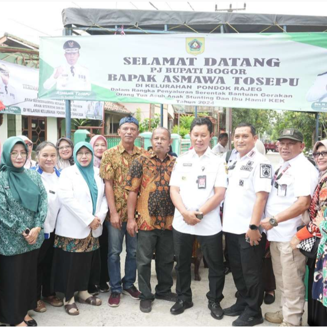 Penjabat (Pj.) Bupati Bogor Asmawa Tosepu lakukan pemberian makanan tambahan bernilai gizi di antaranya dua kilogram beras, satu kilogram ayam dan satu kilogram telur secara langsung kepada anak stunting dan ibu hamil dengan kategori kurang energi kronis (KEK) yang berlangsung di Kelurahan Pondok Rajeg, Kecamatan Cibinong, Rabu (24/7/24).