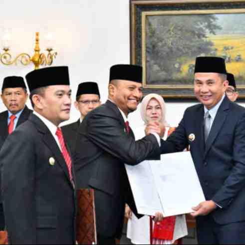 Penjabat (Pj.) Gubernur Jawa Barat Bey Machmudin menyerahkan Keputusan Menteri Dalam Negeri tentang Perpanjangan Masa Jabatan Pj. Bupati Majalengka dan Pj. Bupati Subang di Gedung Pakuan, Kota Bandung...
