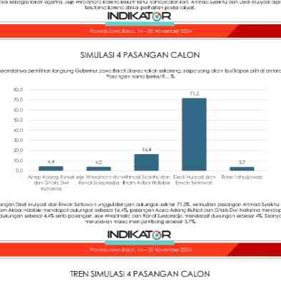 Jelang masa akhir kampanye, Indikator Politik Indonesia merilis hasil survei terbaru Pilgub Jabar. Hasilnya pasangan Kang Dedi Mulyadi (KDM)-Erwan Setiawan masih di posisi teratas.Survei yang dilakuka...