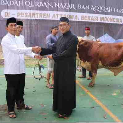 Plh. Bupati Bekasi Iyan Priyatna, didampingi Kepala Bagian Kesra Setda Kabupaten Bekasi Indra Satria Nugraha, menyerahkan sekaligus menyaksikan pemotongan hewan kurban berupa satu ekor sapi di Pondok ...