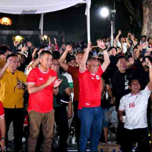 Penjabat (Pj.) Gubernur Jawa Barat Bey Machmudin menyaksikan laga Timnas Indonesia melawan China bersama warga di Jl. Diponegoro, Kota Bandung, Selasa (15/10/2024) malam WIB.Penyelenggara menyiapkan t...