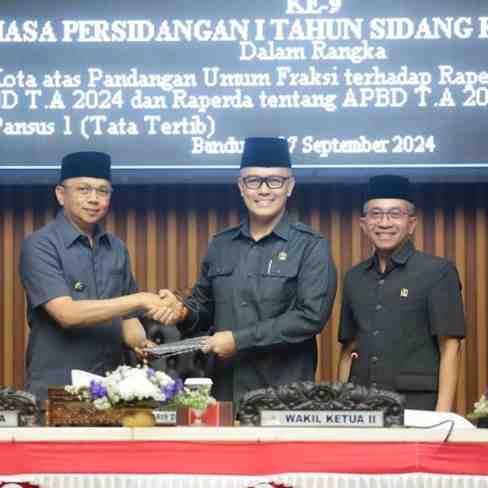 Penjabat Wali Kota Bandung A. Koswara menyampaikan jawaban resmi terhadap pandangan umum fraksi-fraksi DPRD Kota Bandung secara tertulis, dalam rapat paripurna yang digelar di DPRD Kota Bandung, Jalan...