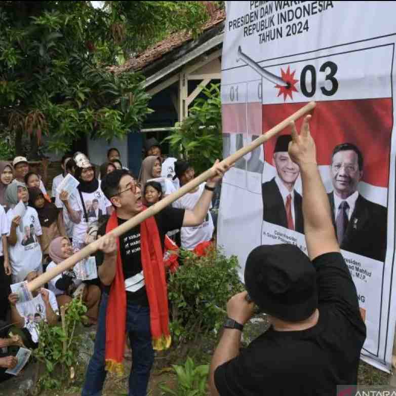 Ketua Tim Pemenangan Nasional (TPN) Ganjar-Mahfud, Arsjad Rasjid, menyosialisasi cara mencoblos pasangan calon nomor urut 3 Ganjar-Mahfud pada tanggal 14 Februari 2024 kepada warga di Desa Barugubug, ...